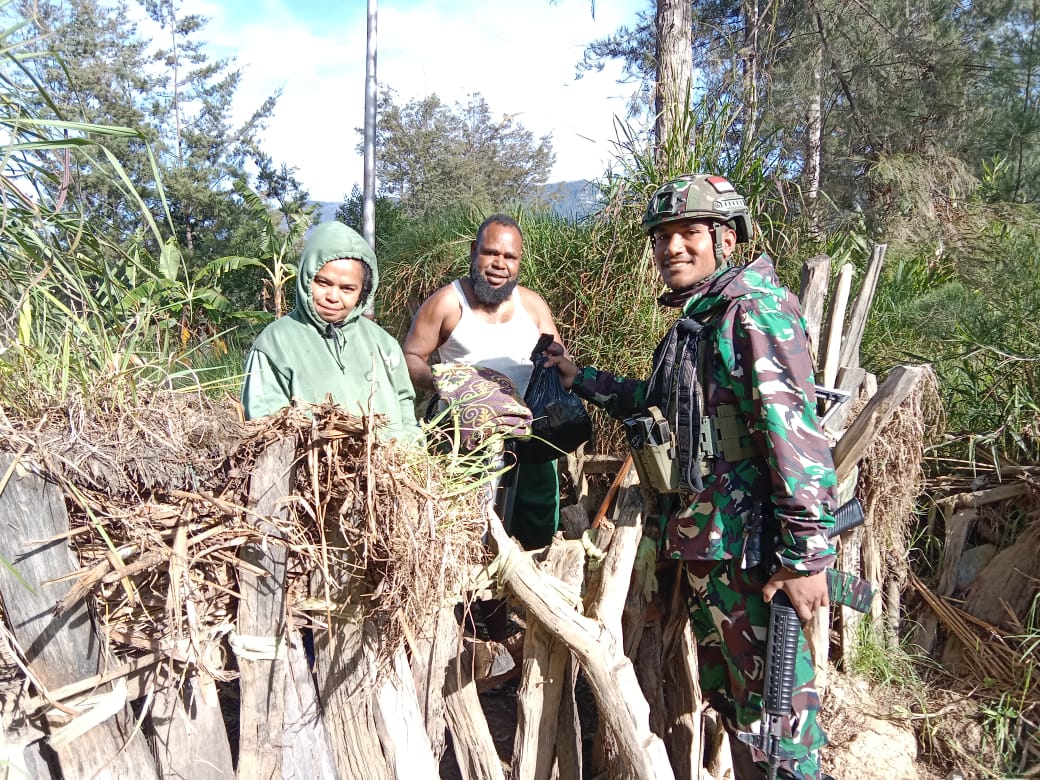 Salah satu warga Kampung Kago Mama Pasek Alom (42) menyampaikan terima kasih kepada personel Satgas Yonif 323/Buaya Putih yang telah memberikan bantuan sembako.