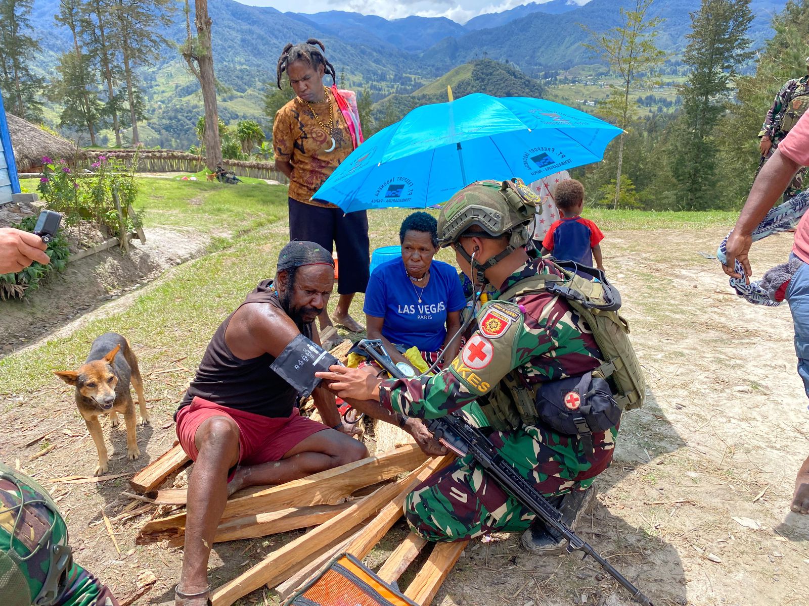 Personel TK Kosatgas Yonif 323 Buaya Putih dipimpin Dokter Satgas Lettu Ckm dr Rifky menggelar acara pengobatan gratis kepada masyarakat Kampung Kimak bertempat di halaman Honai bapak Pilnus