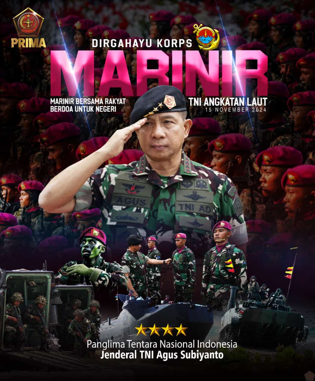 Jakarta, Indonewsone.com – Panglima TNI Jenderal TNI Agus Subiyanto menyampaikan ucapan selamat atas Hari Ulang Tahun ke-79 Korps Marinir TNI Angkatan Laut yang jatuh pada tanggal 15 November 2024.